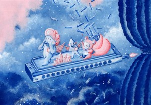 僕のアルバム「空の音色」のジャケットを書いてくれた高岡洋介さんが伊藤さんのお見舞いのために書いた絵。(これはハモニカサンタの譜面の表紙にもなっています)