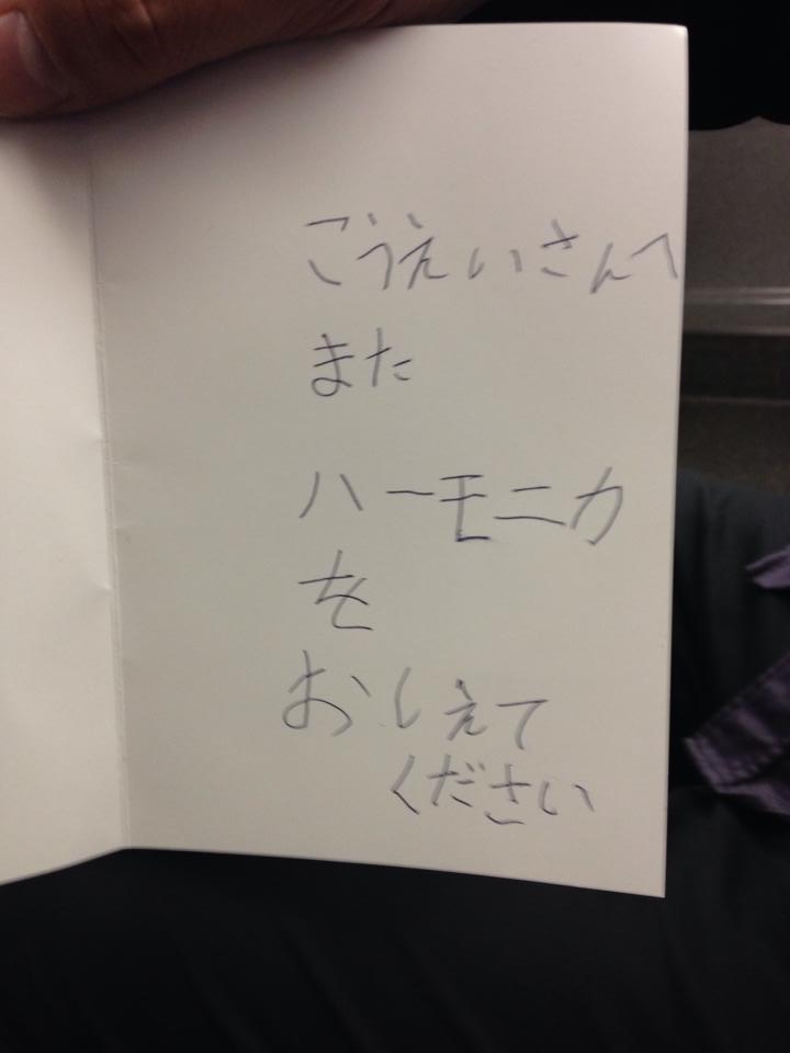 昨年の亘理でのホームカミングデー参加の際に開催したハーモニカ教室を受講してくれたちびっ子がお手紙をくれました!!!「きらきら星」を吹いて聴かせてくれましたよー(^^)